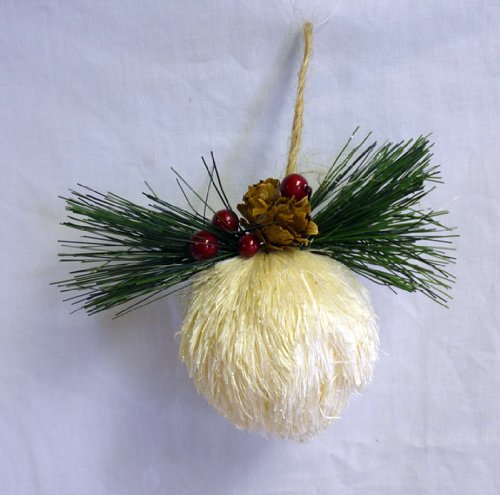 The Sisal Ball Christmas Tree Ornament is made of off-white sisal fiber and is accented by artificial pine needles and berries. It's perfectly unique and right for any holiday decor! Approximately 3" diameter.