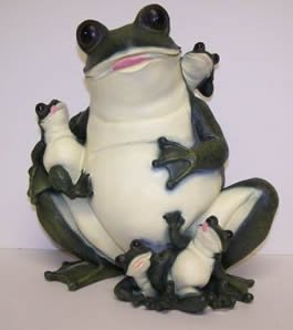 Mama frog with her family of babies all around her. Resin piece. Each has a smiling face and full bellies. Size 12 in ht x 10 in across widest part approx. Nice addition to patio or garden .