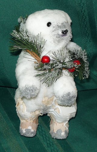 You'll want to keep this adorable birch bark and Christmas cotton bear with his pine and red berry wreath around long after the holiday season has ended. He stands 7 1/2" high.
