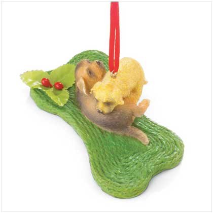 Dogs on bone Christmas ornament. Polyresin. 3/4" x 2 1/8" x 1 1/2" high.