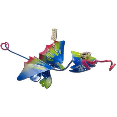 Perfect for your indoor or outdoor garden, this dragon is sure to add some charm. Made out of oxidized and colored copper, with blue and orange glass marble eyes. This well-finished piece comes on a hanging spring with hook that measures 14" when hanging with ornament. When displayed outside the feet attached by heavy copper wire will swing in the wind.