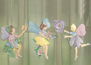 Charming Fairy Ornaments. Wouldn't these be adorable gracing your Christmas tree or use them all year round by hanging them on the wall as art or suspend them from the ceiling with fishing line. Magical and enchanting ! Use them for favors at your next garden or birthday party, make a cute fan pull or hang them from the bottom of a window valance for an extra touch of fantasy. These wonderful colorful metal fairies with sparkles are sure to add a dash of fairy tale fun to any place. These big pieces each stands approximately 6-1/2"H. This set includes three different designs