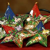 Buy NOVICA Wood ornaments, 'Reindeer Garden' (set of 4). Ornate stars shine with holiday cheer in a festive set of ornaments from India's Syed Izaz Hussein. Each handcrafted star is carved from weeping willow wood and painted with detailed finesse featuring flowers and grazing reindeer. They hang from golden sari threads. Set includes four ornaments in two different sizes.