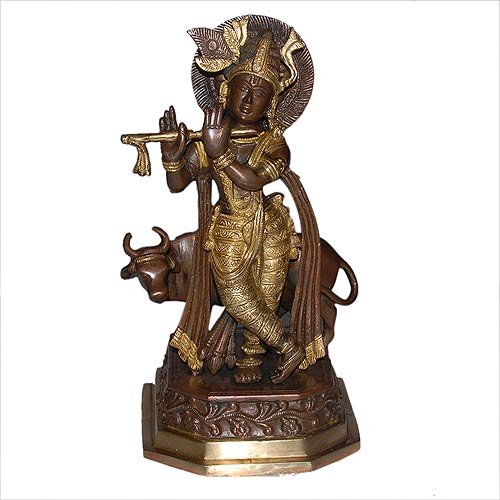 Buy Hindu Religious Statue Krishna Brass Sculpture 12 inches. Krishna is a deity worshiped across many traditions in Hinduism in a variety of perspectives. While many Vaishnava groups recognize him as an avatar of Vishnu, other traditions within Krishnaism consider Krishna to be svayam bhagavan, or the supreme being. Krishna is often depicted as an infant, as a young boy playing a flute as in the Bhagavata Purana or as a youthful prince giving direction and guidance as in the Bhagavad Gita. The stories of Krishna appear across a broad spectrum of Hindu philosophical and theological traditions. They portray him in various roles: a god-child, a prankster, a model lover, a divine hero and the Supreme Being. The principal scriptures discussing Krishna's legends are the Mahabharata, the Harivamsa, the Bhagavata Purana and the Vishnu Purana.