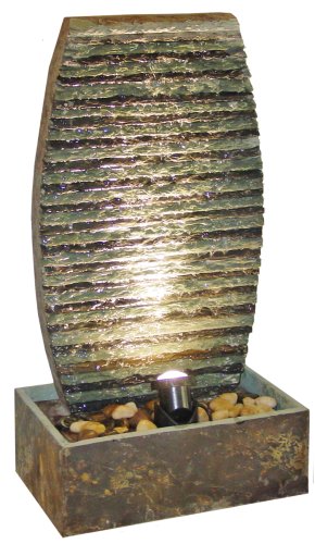 Beckett 7127310 Mini Asian Fountain at a reasonable price. Add the calming sounds of moving water to your home with the Beckett Asian Tabletop Fountain with Light. This fountain evokes far Eastern architecture with its vertical tower and detailed stone finish. The molded rectangular base houses the included pump, and as water is pumped to the top of the display, it beautifully cascades back down over the layered shelves. The unit is enhanced by an included 10 watt halogen lamp at the bottom, shining up through the falling water for a gorgeous display of shimmering, moving light. The light receives power through the provided 120 volt to 12 volt transformer. The slate construction is bound and coated with heavy duty resin and features a fiberglass reinforced basin. This results in a beautiful piece that is far stronger and more durable than pure slate. Bring an atmosphere of peace and serenity to your table with the Asian Tabletop Fountain with Light.